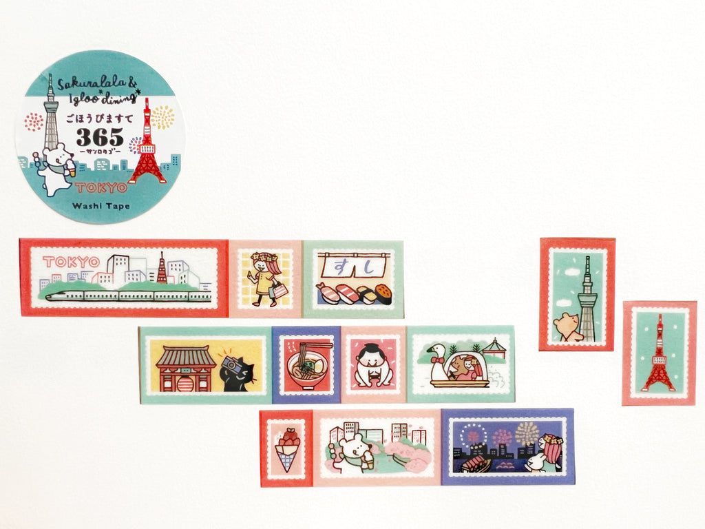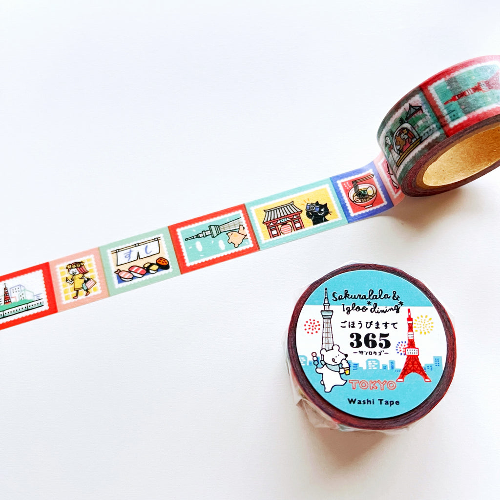 クリアスタンプでお馴染みの365(サンロクゴ)のマスキングテープシリーズ『ごほうびますて365』。第三弾となる今回は国内旅行。このマスキングテープ『TOKYO』は東京と言ったら思い浮かべる東京タワーやスカイツリーの他、お寿司やラーメンの絵柄もあります。手帳やジャーナルノート、季節のお便りやギフトラッピング様々なシーンでお使いいただけます。