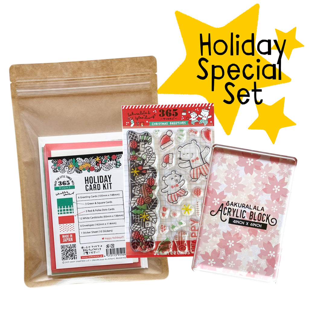 The first release is the clear stamp " 365: Christmas Greetings " that you can use to make Christmas cards. We have prepared a "Holiday Card Kit" that includes a set of paper items so that you can quickly make Christmas cards using this stamp . This set includes 2-in-1 A5 Pattern Paper folded in half, envelopes, white cardstock, and a sticker sheet exclusive to this set.