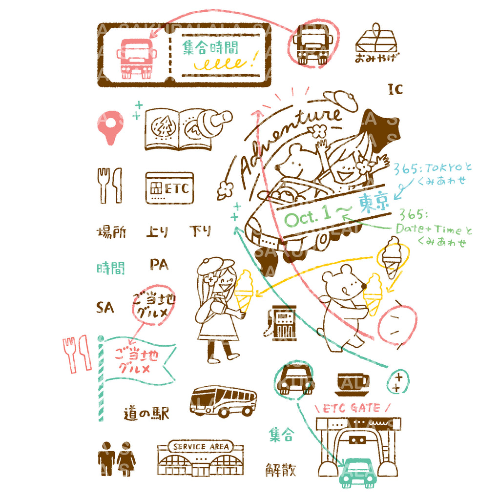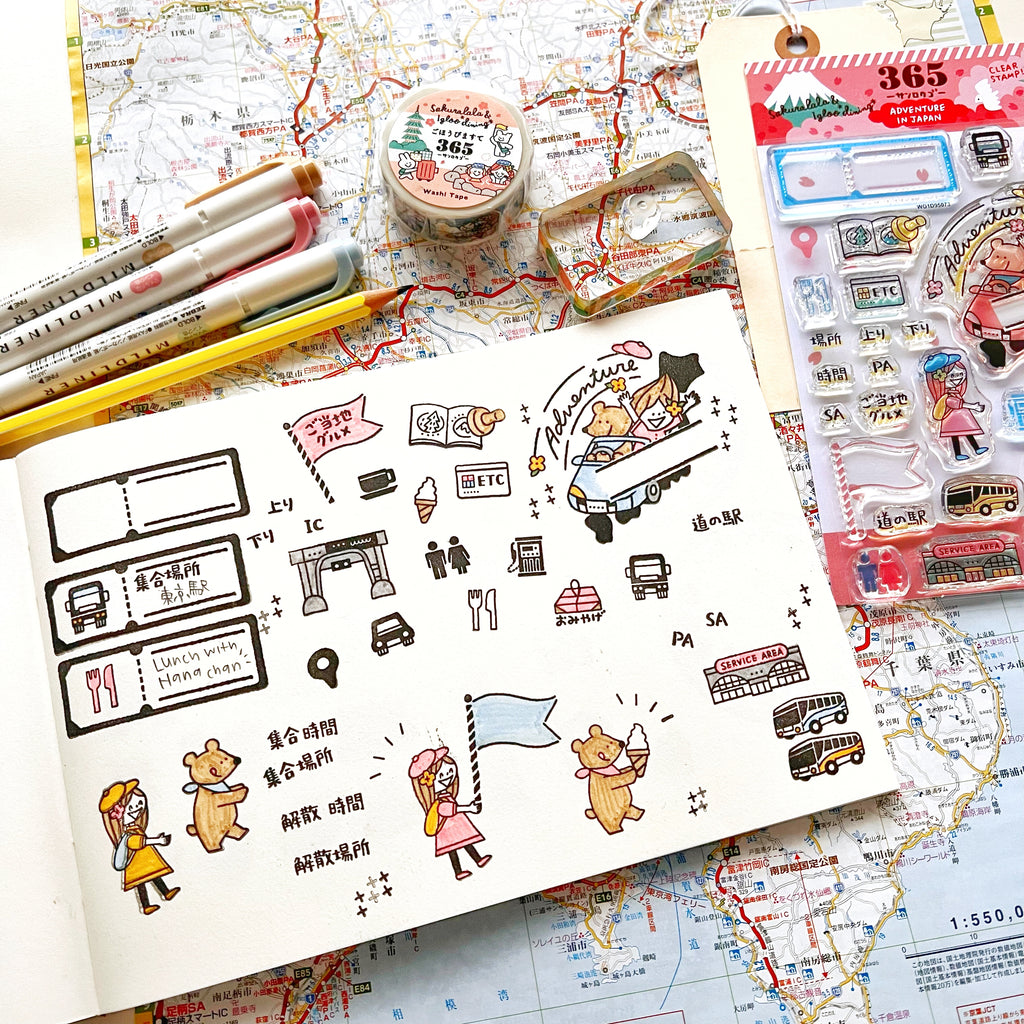 * For stamps featuring Hana-chan and Kuma-chan on a road trip around Japan, you can write in the date and destination using "365: TOKYO" or " 365: Date + Time "!