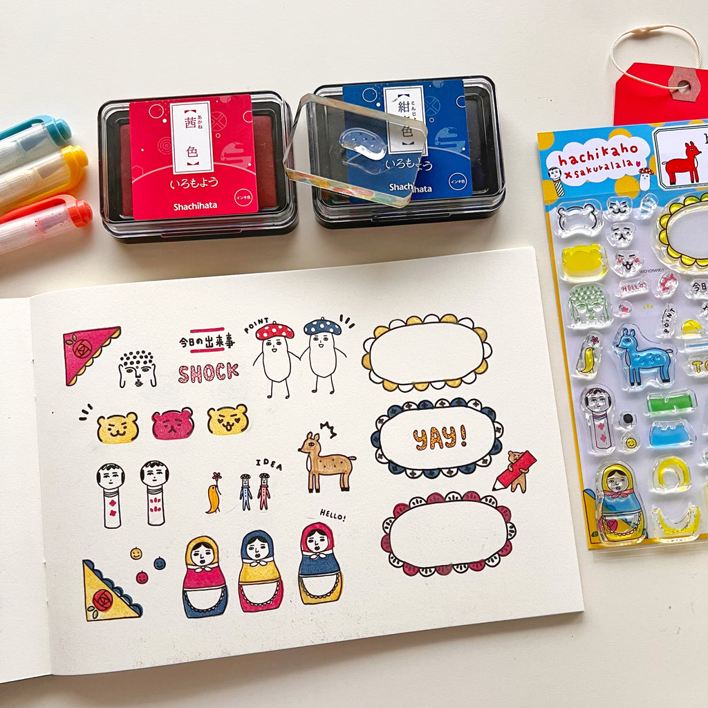 Hachikaho shares how-to's for her favorite stationery and journals on Instagram and YouTube. The first collaboration, "happy diary," is a clear stamp set featuring Hachikaho's signature design.