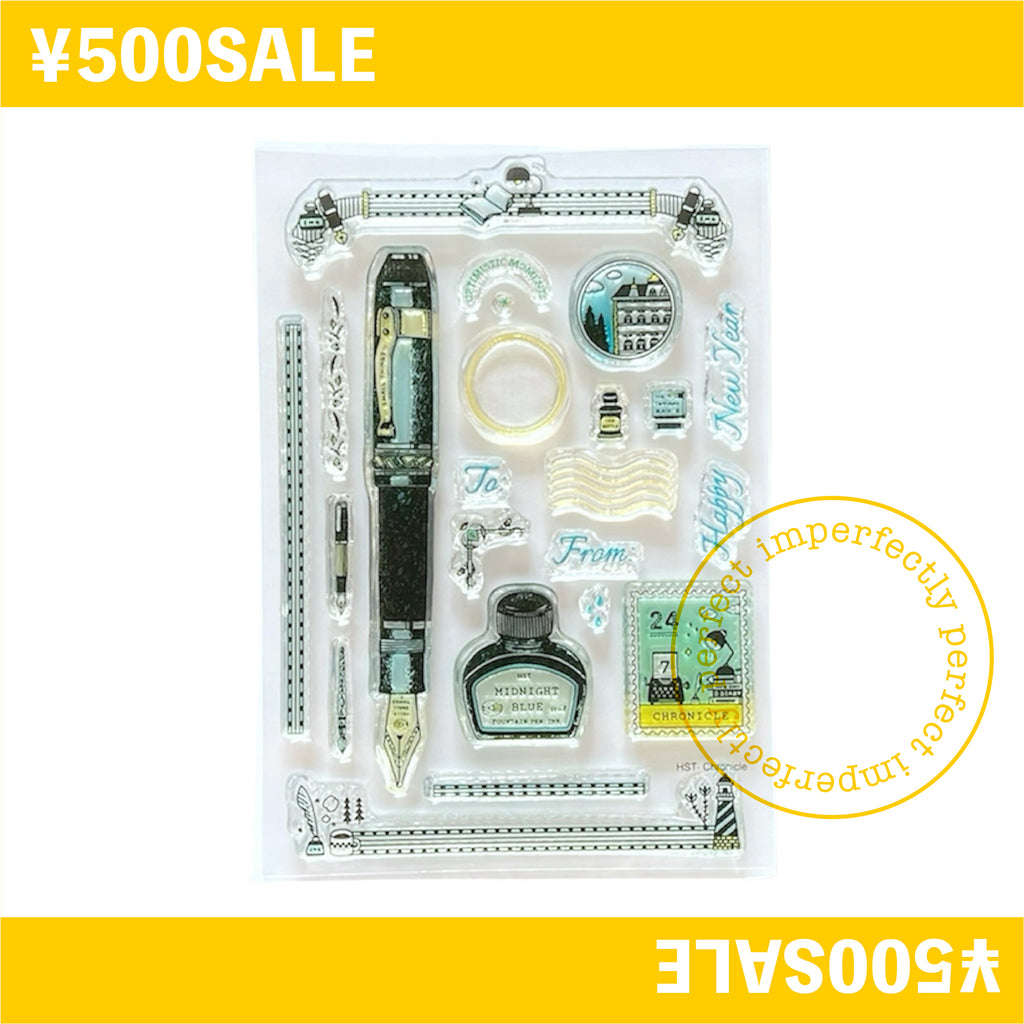 - This product does not include the acrylic blocks used for the clear stamps. The "Fountain Pen" stamp is approximately 11cm x 2.5cm, so a 1.5 x 7 acrylic block will cover it. It can also be used by attaching it diagonally to a 3.5 x 3.5 acrylic block.
